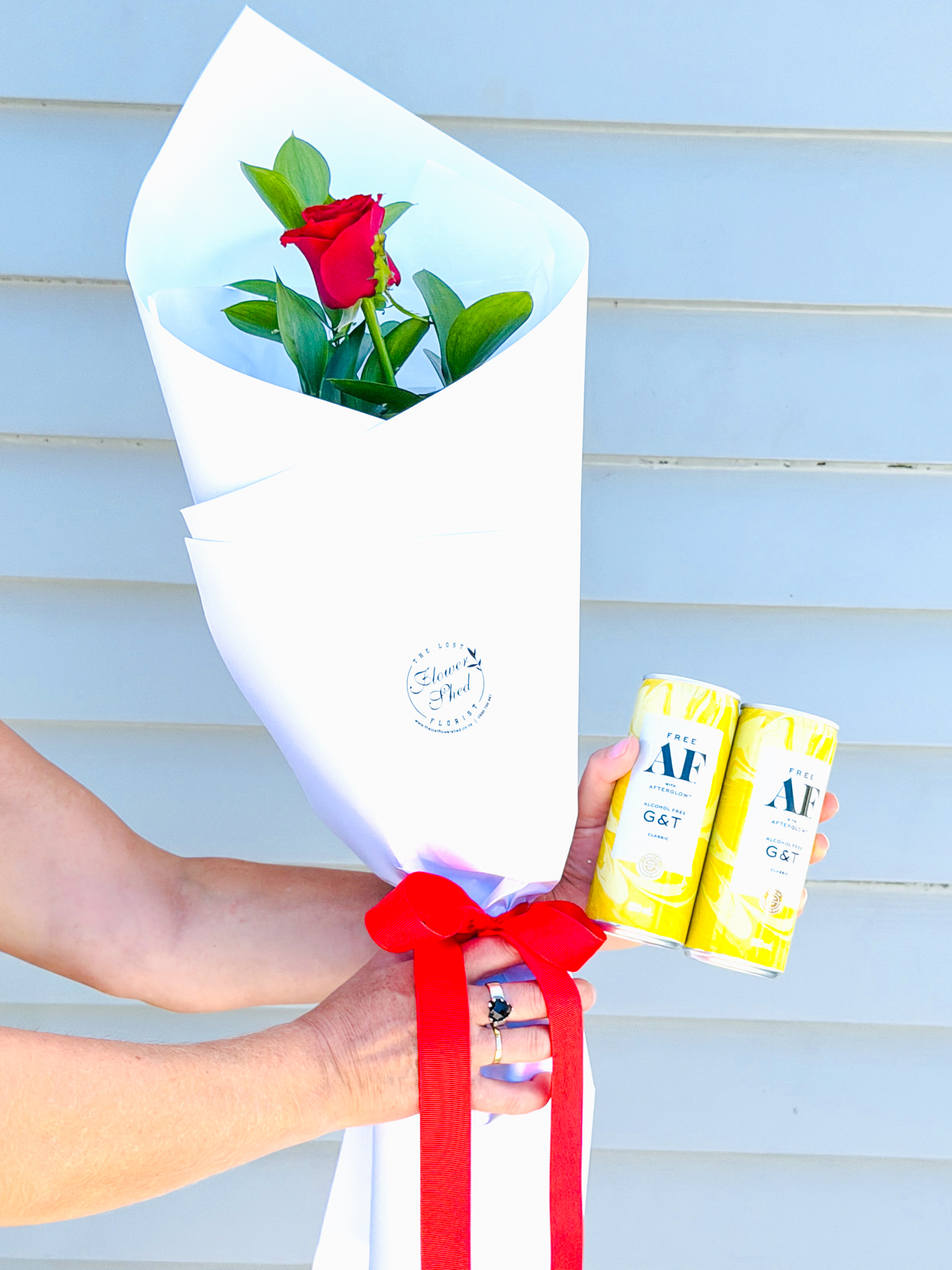 A single red rose for the romance, plus two Free AF G&Ts for a refreshing, alcohol-free toast.