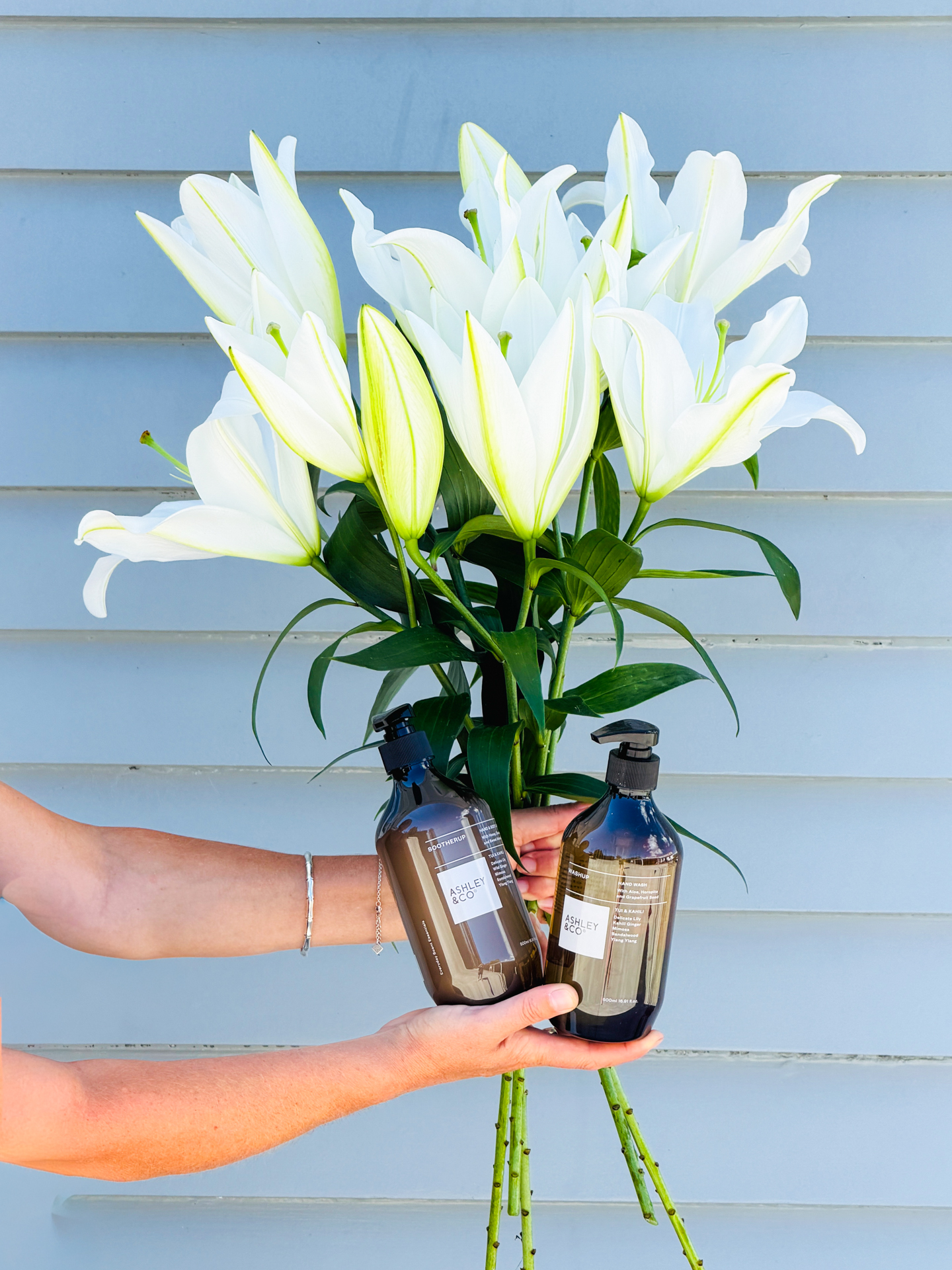 Ashley & Co Washup and Sootherup combo in your choice of fragrance, paired with a beautiful bunch of fresh, long-stemmed lilies. Please note that lily colour will vary based on what is available on the day.