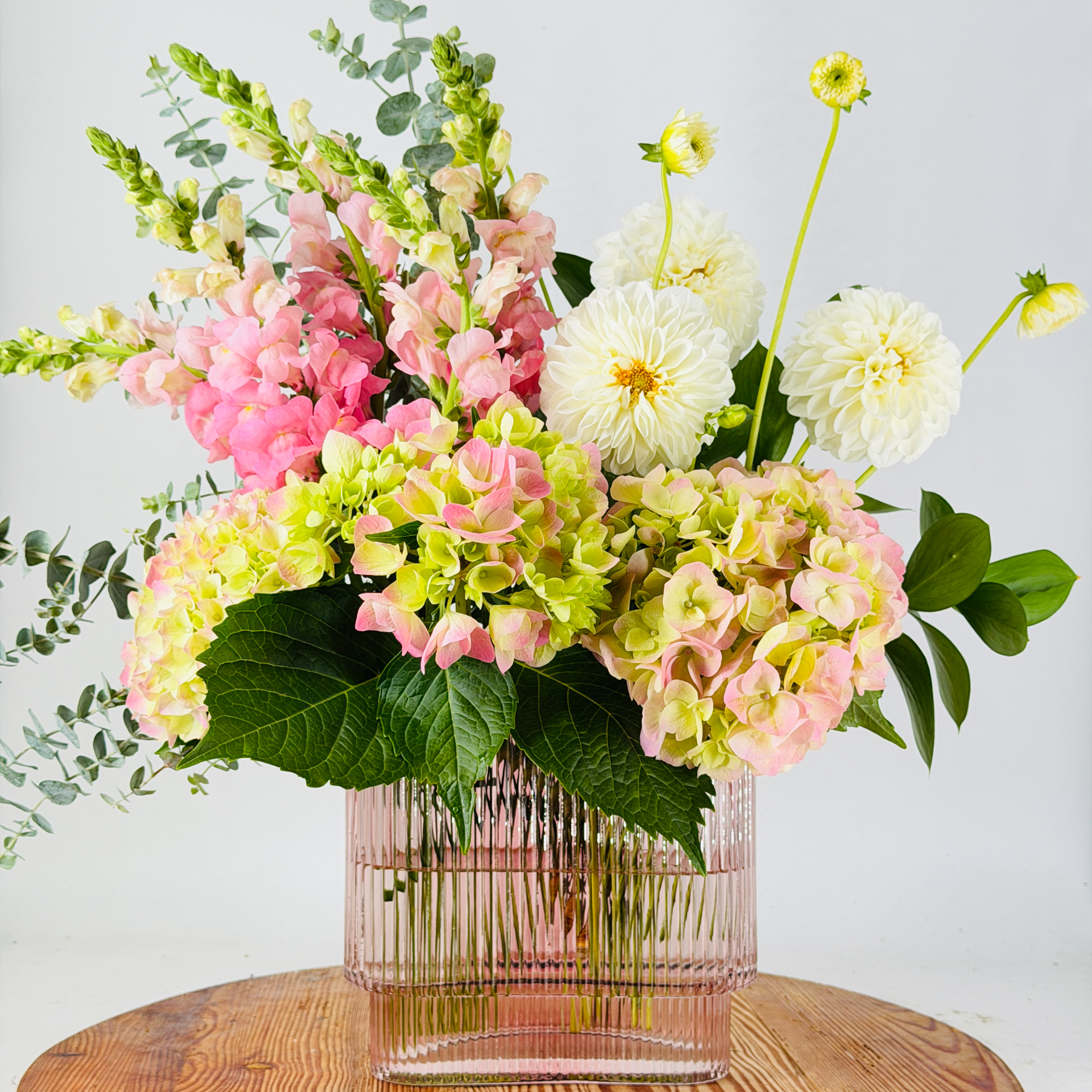• Pink Glass Vase – A stylish and reusable vase wide vase that complements the blooms and adds a pop of colour.