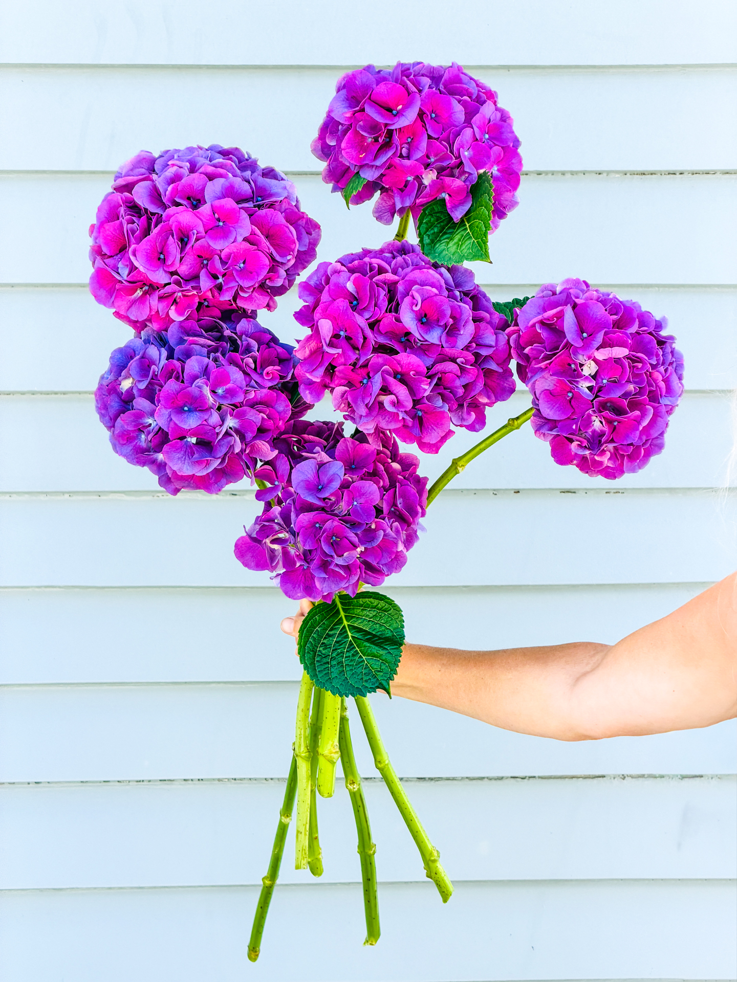 Beautiful fresh, long-stemmed hydrangeas, wrapped and ready for delivery.