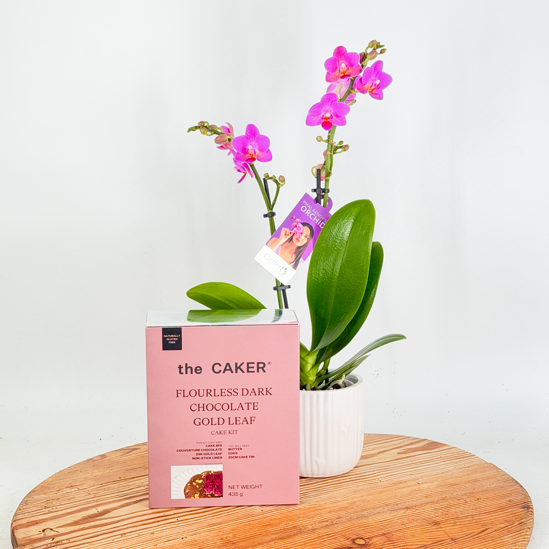 This thoughtful pairing features a Mini Phalaenopsis Orchid Plant, known for its elegant, long-lasting blooms, alongside The Caker’s famous Chocolate Cake Kit — a rich, fudgy classic that makes home baking effortless and delicious.